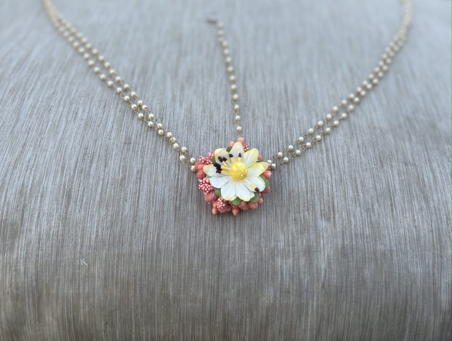The beautifully handcrafted mathapatti with peach berries and off white dry flowers with yellow bud that makes your forehead look super pretty and elegant.