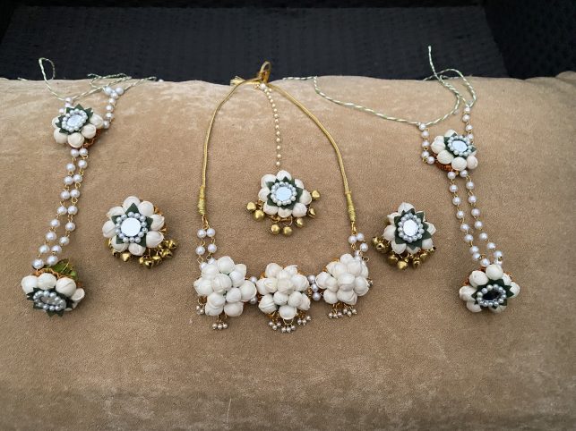 Stylish and elegant mogra floral jewellery for haldi or mehendi functions are the latest craze in town.