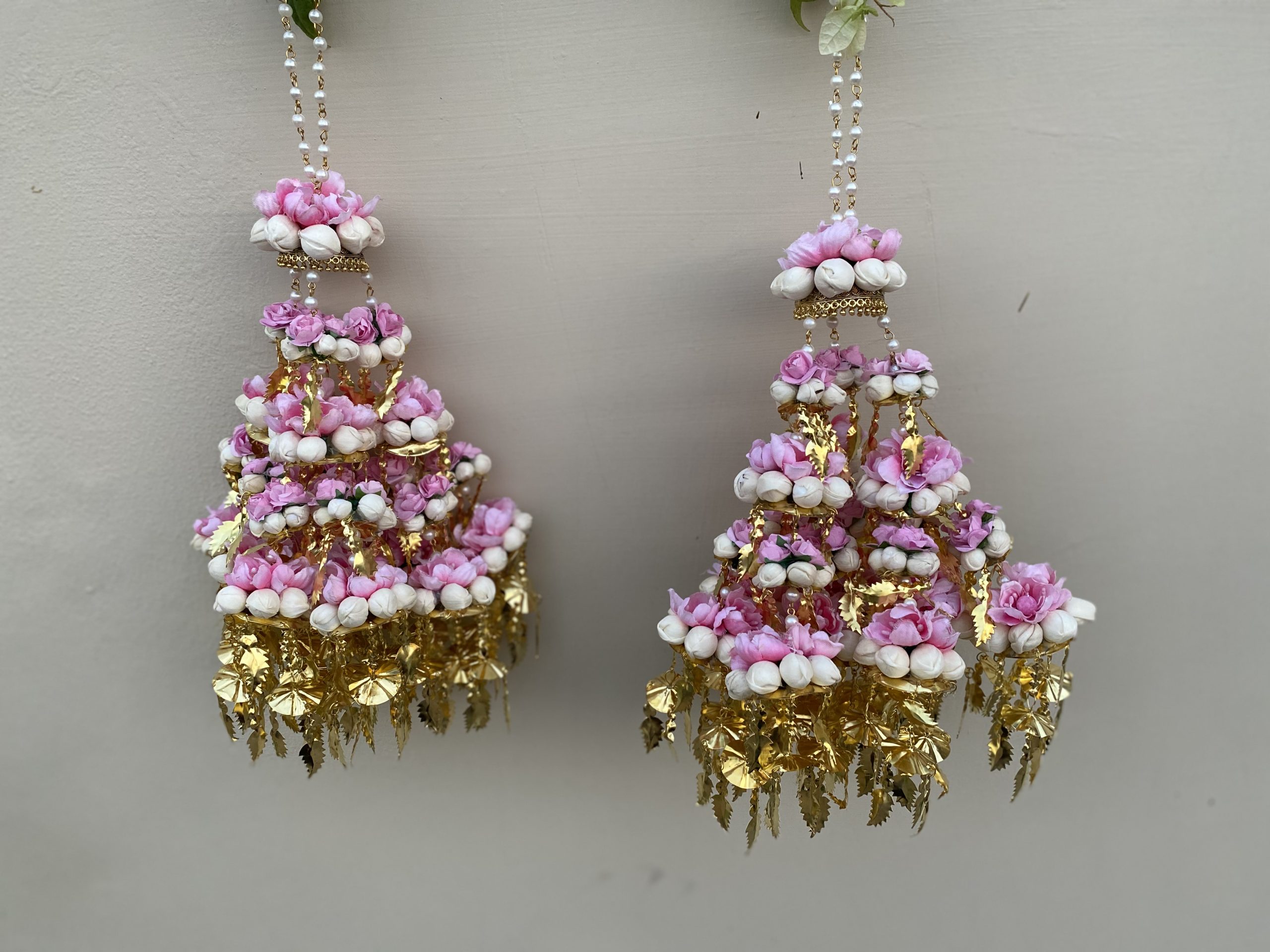 These custom-made Elegant 3 tier Floral Kaleeras for the beautiful bride are the archetypal accessories that embellish a bride’s overall look, adding to her charm and elegance. Handcrafted with pink silk flowers and white mogras for one of the gorgeous look of the bride., these traditional golden kaleeras only add to her charm and allure. We at Flo- Saira know how special our brides are and thus keep our design aesthetics very well aligned.