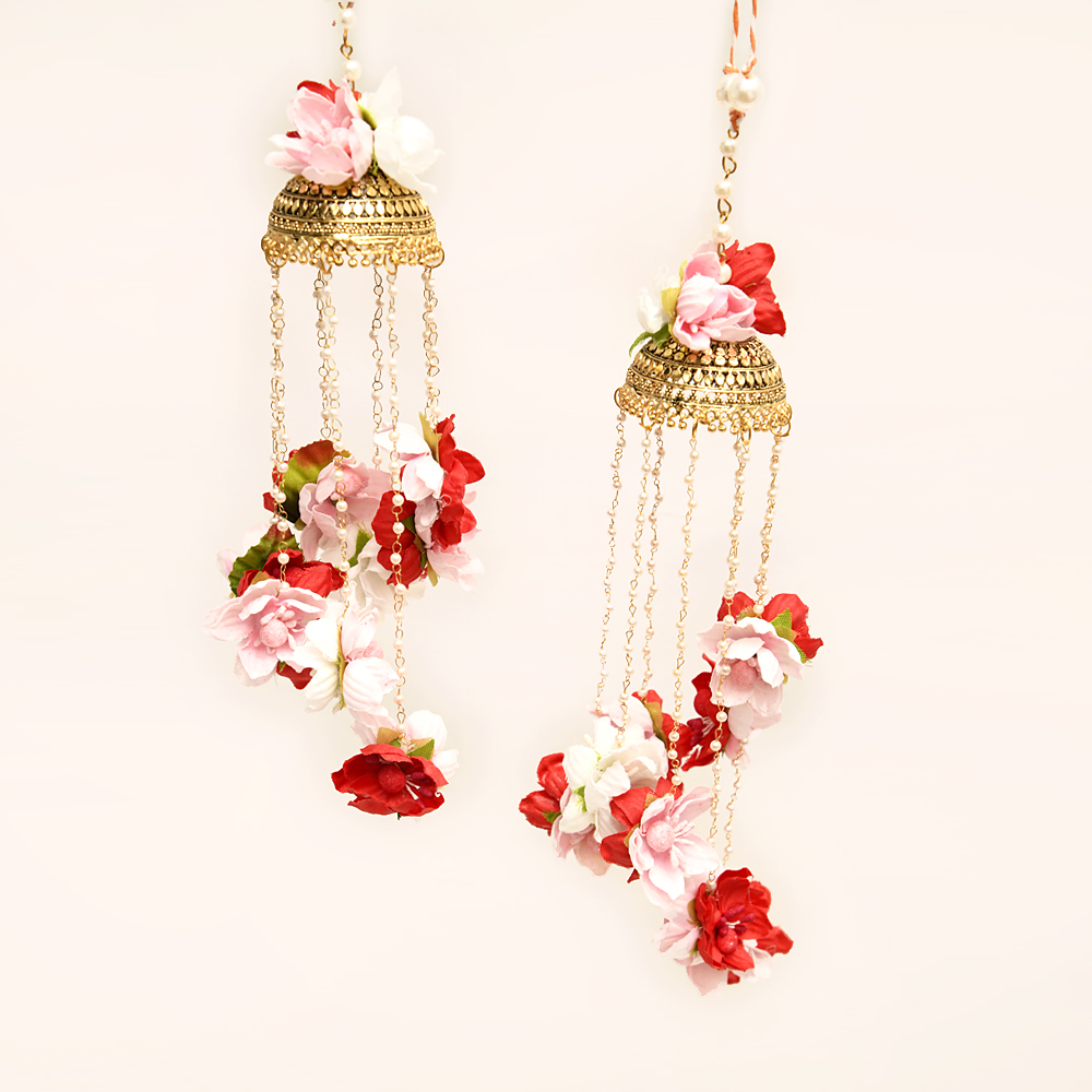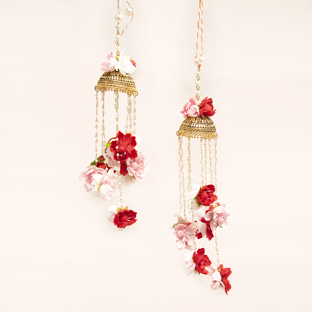These handcrafted Kaleeras are made up of white, pink and red silk flowers with traditional golden kaleeras for one of the most scintillating and gorgeous look of the bride.